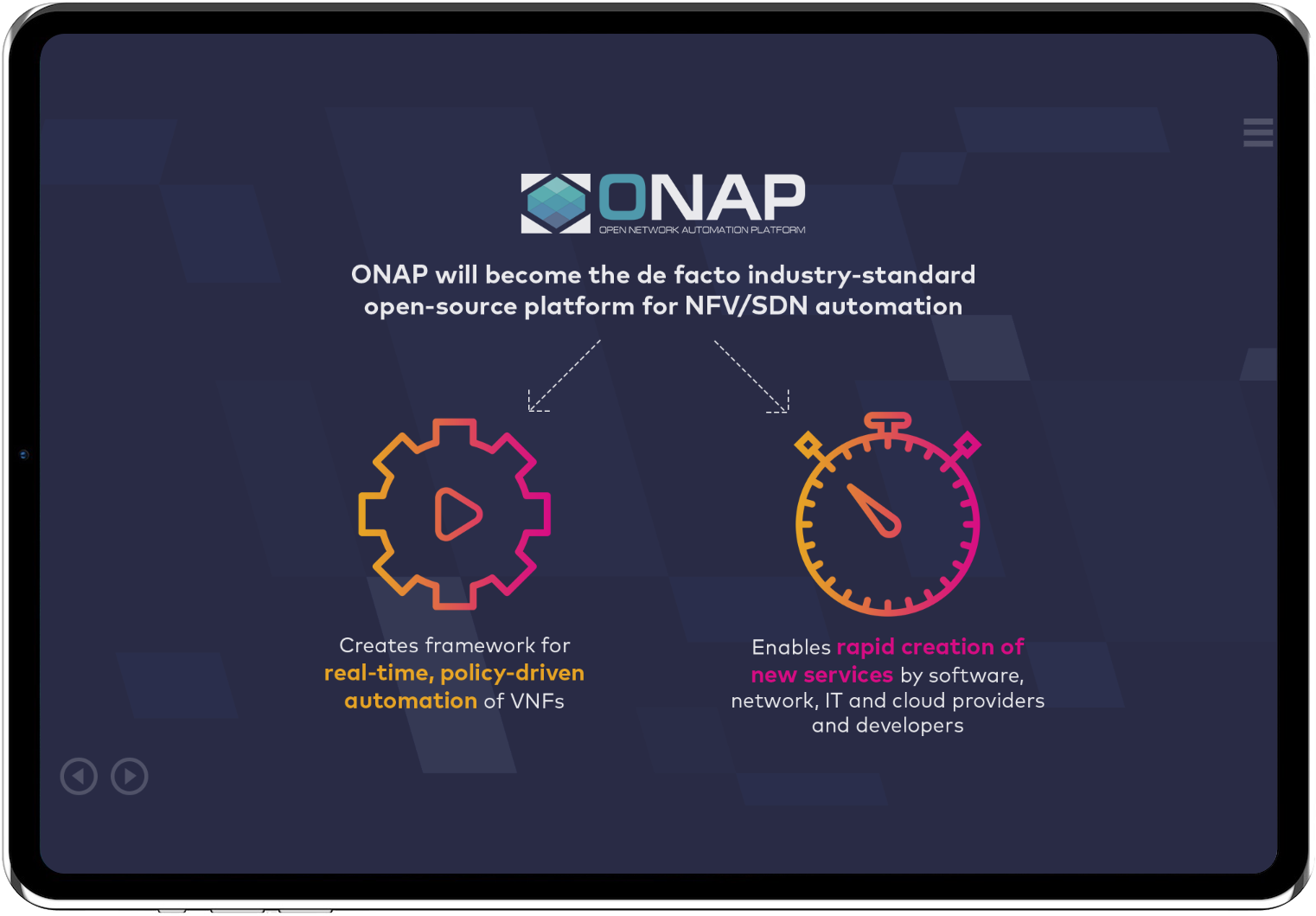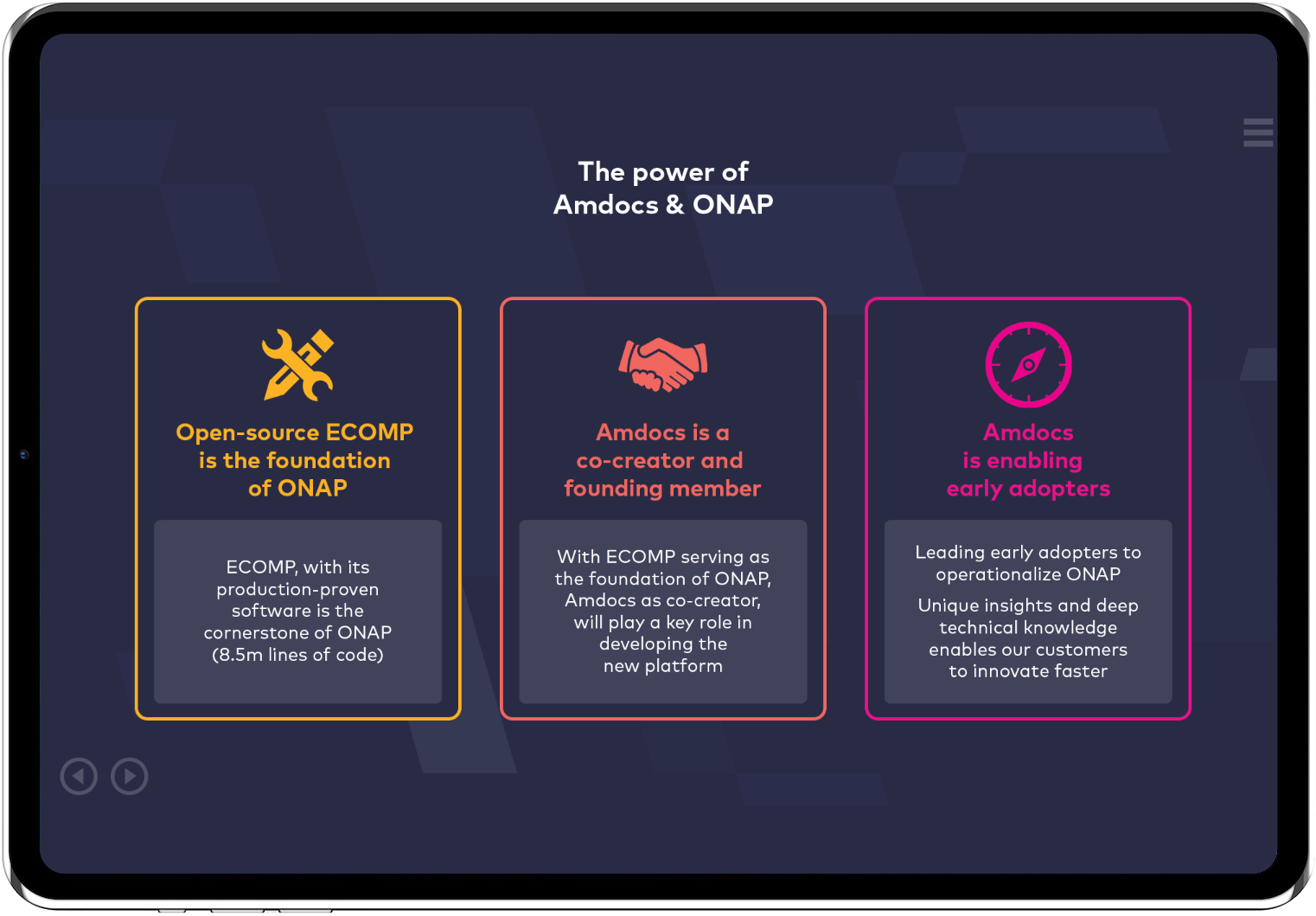 Cogent created a PowerPoint presentation which was aimed at a CTO audience. Adding new imagery and icons as required. All within the framework of the Amdocs brand identity and guidelines.